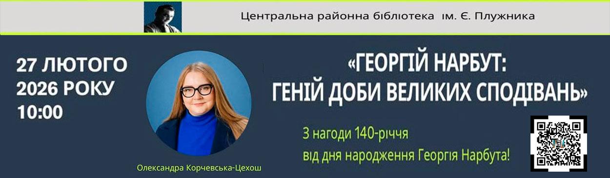 Центральна районна бібліотека ім. Є. Плужника запрошує на онлайн-зустріч із графічною та діджитал-дизайнеркою Олександрою Корчевською-Цехош «Георгій Нарбут: геній доби великих сподівань». Захід присвячений 140-річчю від дня народження Георгія Нарбута (1886-1920) – видатного українського графіка, автора Докладніше