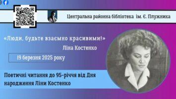 З нагоди 95-річчя від дня народження Ліни Костенко, Центральна районна бібліотека ім. Є.  Плужника пропонує до вашої уваги поетичні читання «Люди, будьте взаємно красивими!». Ліна Василівна Костенко – українська письменниця, поетеса-шістдесятниця та громадська діячка, творчість Докладніше