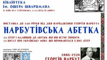 До 140-річчя від дня народження видатного українського художника-графіка та ілюстратора Георгія Нарбута в бібліотеці ім. О. Шварцмана відкривається виставка «Нарбутівська абетка». 14 літер встиг оформити художник до своєї смерті. 14 цитат про українську мову, що Докладніше