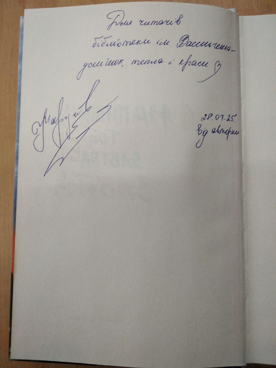 Особливо приємно, що цю книжку нам подарувала авторка. На ній є підпис для читачів бібліотеки імені Степана Васильченка: «Усмішок тепла і краси», і замість крапочки намальоване сердечко. Думаю, саме тому наші читачі із задоволенням читають цю історію.