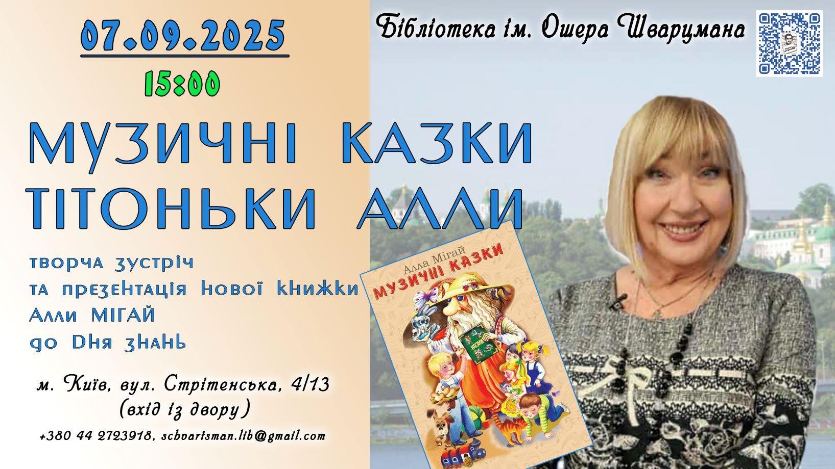 Запрошуємо дітлахів, а також їх батьків, бабусь і дідусів на зустріч з яскравою та неперевершеною Тітонькою Аллою – поетом і композитором, співачкою та телеведучою, заслуженою діячкою мистецтв України Аллою Мігай та її новою дитячою книгою «Музичні казки».