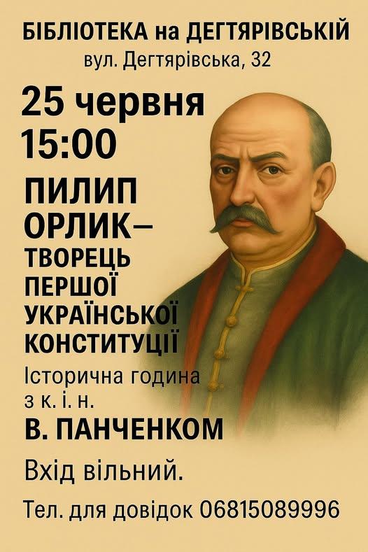 Напередодні Дня Конституції запрошуємо в Бібліотеку на Дегтярівській на історичну годину «ПИЛИП ОРЛИК ТВОРЕЦЬ ПЕРШОЇ УКРАЇНСЬКОЇ КОНСТИТУЦІЇ» з Володимиром Панченком.