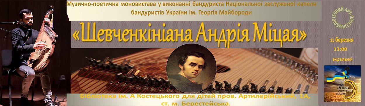 Бібліотека ім. А. Костецького для дітей запрошує на музично-поетичну моновиставу у виконанні бандуриста Національної заслуженої капели бандуристів України ім. Георгія Майбороди  «Шевченкініана Андрія Міцая»