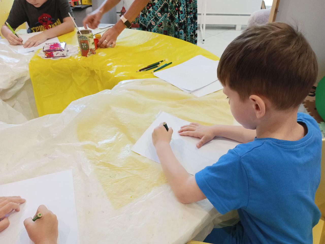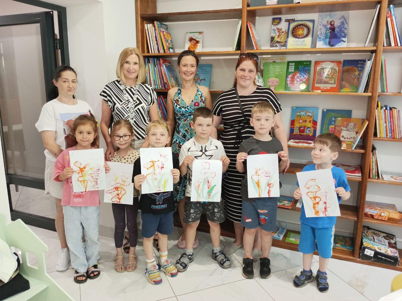 Цього дня для маленьких гостей із ДНЗ №467 ми провели яскраву артмайстерку «Чарівна нитка: малюємо квітку ниткографією» під керівництвом художниці бібліотеки Ганни Колтукової.