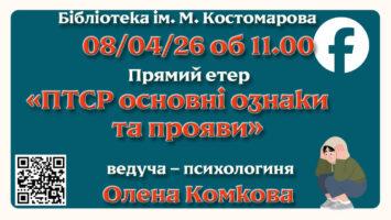 Анонс📢! ПТСР: основні ознаки та прояви. Прямий етер з психологинею бібліотеки ім. М. Костомарова
