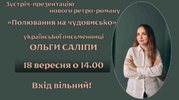 Бібліотека ім. М. Костомарова запрошує на захопливу зустріч-презентацію нового ретро-роману української письменниці Ольги Саліпи – «Полювання на чудовисько». На зустрічі ви: ✨ Познайомитеся з авторкою та дізнаєтеся, що надихнуло її на створення роману. ✨ Почуєте Докладніше
