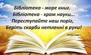 Бібліотека… Серце завмира, Коли пірнаю в тишу таємничу, Святилище пізнання і добра, Що в майбуття через минуле кличе.     І осягнути незбагненну суть     Світобудови прагну заповзято,     Коли мені з полиці дістають     Важкі Докладніше