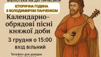 Бібліотека на Дегтярівській запрошує на історичну годину «Календарно-обрядові пісні княжої доби»  з к.і.н., провідним спеціалістом Музей Гетьманства – Володимиром Панченком. КОЛИ: 3 грудня (середа) 2025 року о 15:00 ДЕ: Бібліотека на Дегтярівській (вул. Дегтярівська, 32) Вхід вільний. Докладніше