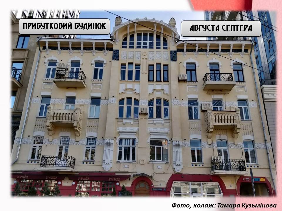 Одним із кращих зразків архітектури раннього європейського модерну того періоду залишається колишній 4-поверховий прибутковий будинок на Бульварно-Кудрявській №19. Він зводився у 1909-1910 роках за проектом архітектора Клуга Мартина Вільгельмовича на замовлення купця Августа Септера, власника популярної на той час у Києві кондитерської біля Сінного ринку. Ділянка, на якій стоїть будинок, належала попаді Єкатерині Флоринській, тут стояв двоповерховий кам’яно-дерев’яний будинок. У 1899 році цю ділянку придбав Август Септер, київський купець 2-ї гільдії з міста Ревеля (нині — Таллінн). Кондитерська і сьогодні розташована у будинку. При чому теперішні власники додали йому додаткового шарму за рахунок оформлення кондитерської у червоному кольорі.