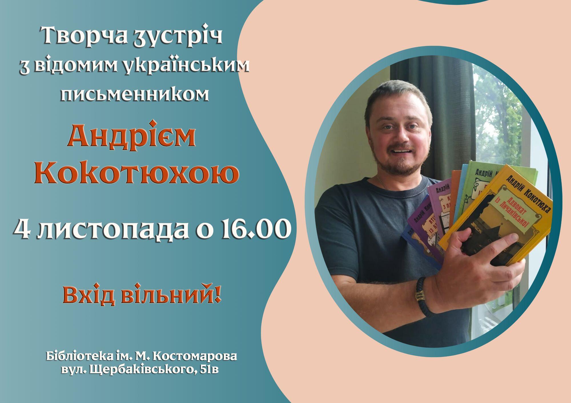Бібліотека ім. М. Костомарова запрошує на творчу зустріч із відомим українським письменником, сценаристом та журналістом Андрієм Кокотюхою.