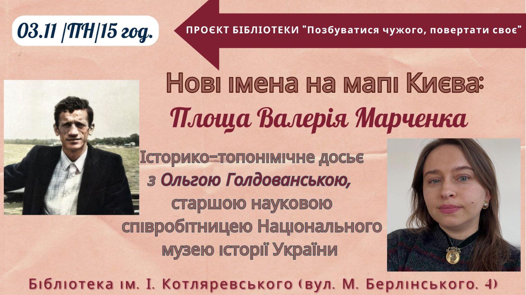 Бібліотека ім. І. Котляревського запрошує на історико-топонімічне досьє «Нові імена на мапі Києва: Площа Валерія Марченка» з Ольгою Голдованською, старшою науковою співробітницею Національного музею історії України, в межах бібліотечного проєкту «Позбуватися чужого, повертати своє».