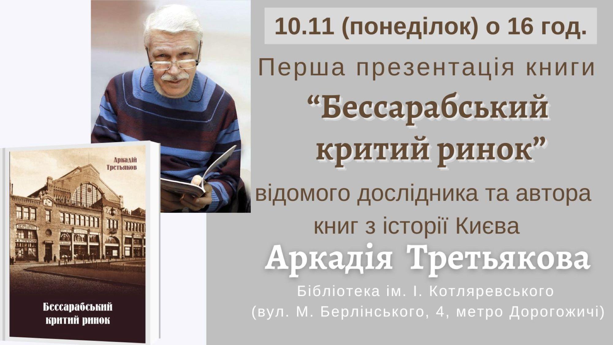 Бібліотека ім. І. Котляревського запрошує вас на першу презентацію нової книги відомого києвознавця Аркадія Третьякова «Бессарабський критий ринок».