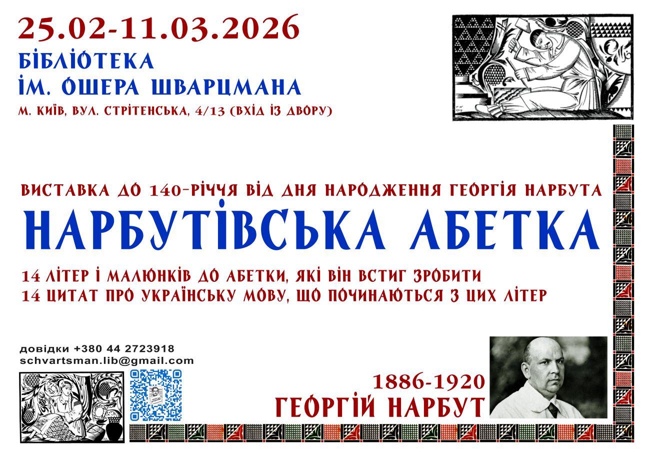 Бібліотека ім. О. Шварцмана запрошує на виставку «Нарбутівська абетка» до 140-річчя від дня народження видатного українського художника-графіка та ілюстратора Георгія Нарбута.