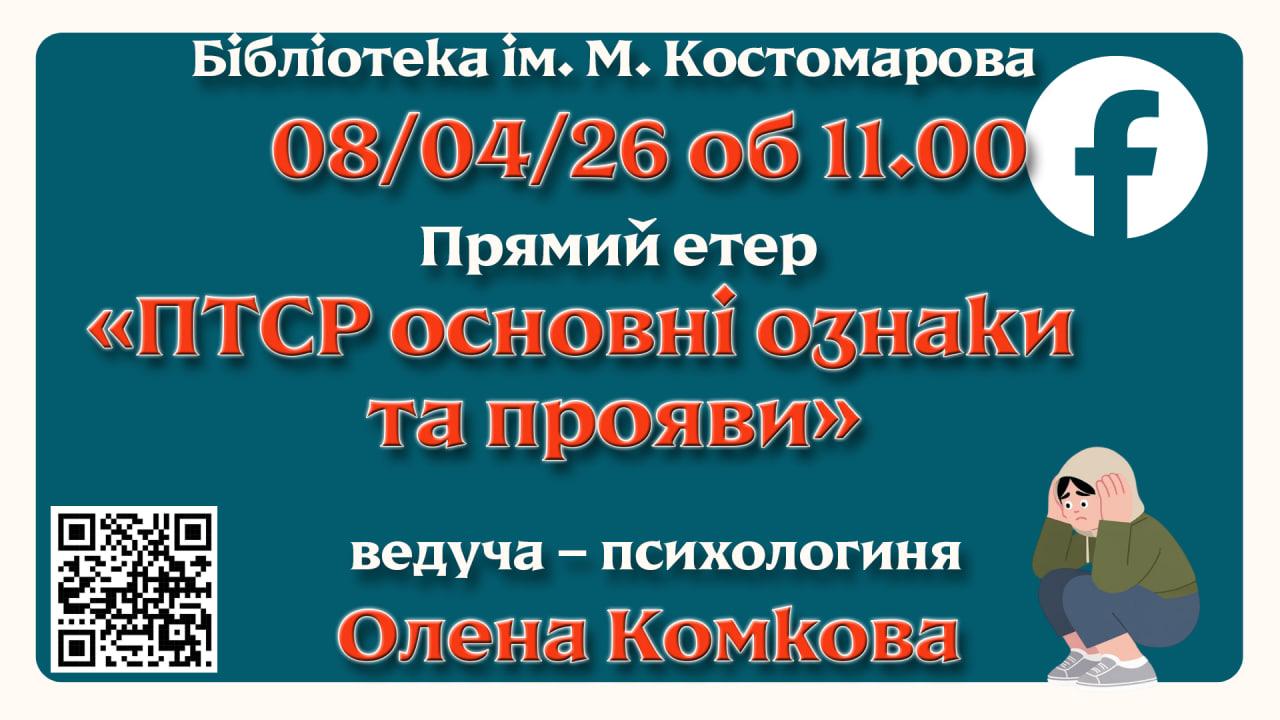 Запрошуємо на прямий етер із психологинею бібліотеки ім. М. Костомарова Оленою Комковою, де поговоримо про ПТСР, його симптоми та перші кроки до відновлення.