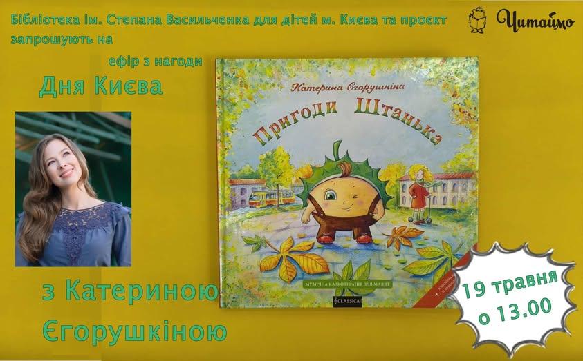 Наближається День Києва, і бібліотека ім. С. Васильченка для дітей запрошує всіх охочих на ефір із письменницею Катериною Єгорушкіною, авторкою книжки "Пригоди Штанька" про сміливого та завзятого каштанчика та його друзів, і багатьох інших історій.