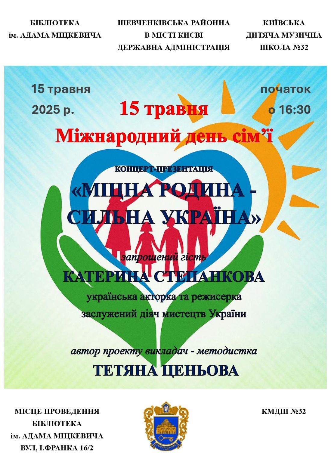 До Міжнародного дня сім’ї Бібліотека імені Адама Міцкевича, Київська дитяча школа мистецтв №32, Шевченківська районна в місті Києві державна адміністрація запрошують на концерт-презентацію «Міцна родина – сильна Україна».