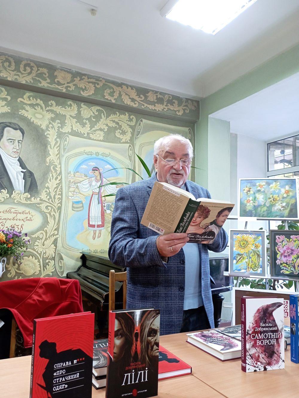 Василь Добрянський – Лауреат численних та почесних літературних відзнак, як «Коронація_слова», «Золотий_пістоль», автор 30 романів, пан Василь заволодів увагою аудиторії та випромінював стільки позитиву, ніби завітав до давніх знайомих. Привіз презентувати свої книжкові новинки, тож читачі зацікавлено слухали історії про героїв його книг: пані Валевську і Наполеона, Павла Скоропадського і детектива Жеграя, розслідування злочинів і неймовірні історії кохання…