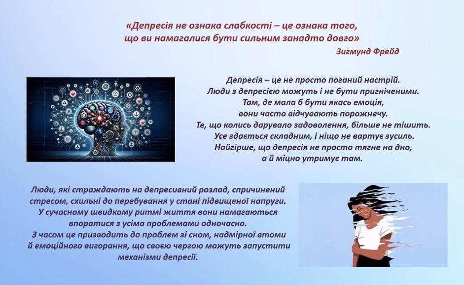 Депресія стає однією з найпоширеніших психологічних проблем у сучасному суспільстві. За даними Всесвітньої організації охорони здоров’я від депресії страждає близько 300 мільйонів людей у всьому світі. Це стан психіки, що характеризується постійним відчуттям смутку, втратою інтересу до раніше приємних видів діяльності та негативною оцінкою себе, оточуючих і світу загалом.